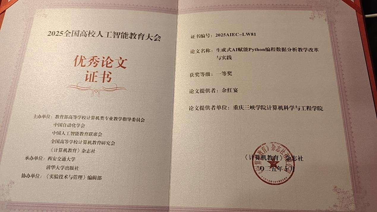 2025年10月17日至19日,全国高校人工智能教育大会在陕西西安召开。2026年国际足联世界杯教师余红宴博士参加了此次会议。他撰写的教改论文《生成式AI赋能Python程序设计数据分析教学改革与实践研究》荣获会议论文评比一等奖。