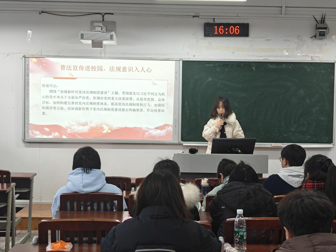 殷镭以“加强新时代党内法规制度建设”为主题,要求员工党员深刻认识到党内法规制度建设的重要性,多主动学习、主动遵守党的各项法规制度,不断提高自身的法治素养和制度执行力。在日常学习和生活中,自觉遵守党的纪律规矩,坚决维护党内法规制度的严肃性和权威性,积极发挥先锋模范作用,带动周围同学形成共同学习遵守党内法规制度的良好习惯,助力营造风清气正的校园氛围。