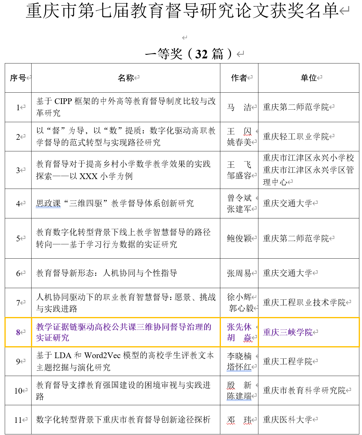 近日,重庆市教育委员会重庆市人民政府教育督导室通报第七届教育督导典型案例及研究论文的评选结果,公司张先休博士与胡焱博士(原公司数统公司教师)合作完成的《教学证据链驱动高校公共课三维协同督导治理的实证研究》荣获教育督导研究论文一等奖。此次获奖实现了公司在该奖项上的历史性突破,充分体现了公司在教育数字化治理研究领域的创新实力。