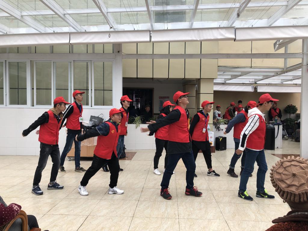 出发前,青年志愿者们都充满期待,期待能为老人们带去快乐。来到福利院,恰逢赶上老人们活动时间,志愿者们随即将准备已久的文艺节目一一表演。在表演和交谈中,现场气氛变得和谐、温馨,欢声笑语充满了整个福利院。表演结束后,志愿者们在院方工作人员的安排下对福利院场地和设施进行义务清洁、维修等。